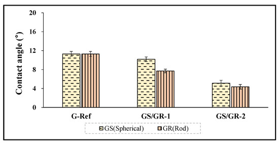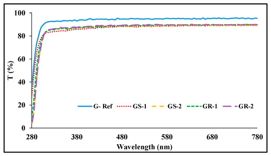 With regard to the spectral transmittance of the sphere-shaped gold nanoparticles, GS-1 exhibited transmittances of 63.97%, 84.45%, and 88.45%, and GS-2 exhibited transmittances of 54.92%, 86.09%, and 89.22%. In addition, in the case of the spectral transmittance of the rod-shaped gold nanoparticles, GR-1 exhibited transmittances of 49.13%, 86.80%, and 89.46%, respectively, and GR-2 exhibited transmittances of 48.87%, 86.35%, and 88.75%. Under the influence of the gold nanoparticles, the transmittance decreased again compared with that of G-Ref, but it was found that the UV-B region was blocked to some extent by the addition of the gold nanoparticles regardless of the type of nanoparticles. In particular, the sample with rod-shaped gold nano added exhibited a higher blocking rate to some extent compared with the sphere-shaped sample. The measurement results of light transmittance are presented Figure 7.