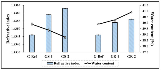As a result of measuring the refractive index and water content of Ref, it was 1.4355% and 38.44%, respectively. However, in the case of the Rg1 combination, the change in the physical properties of the water content and refractive index was insignificant in comparison with Ref. On the other hand, in the case of the Rg3 combination, the water content increased as the amount of addition increased, and the refractive index was inversely proportional to the water content. The physical properties of the prepared lenses are presented in Table 2.