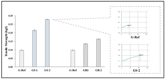 To examine the physical properties according to the addition of nanoparticles, the refractive index, water content, tensile strength, and oxygen permeability of the prepared lens were measured. As a result of comparing them with those of G-Ref, the refractive index and tensile strength gradually increased according to the amount of gold nanoparticles added regardless of the type of gold nanoparticles, and in particular, the refractive index and tensile strength of the lenses with sphere-shaped gold nanoparticles added were high, which was considered to be influenced by the refractive index, and the tensile strength increased in all samples with gold nanoparticles added. In addition, in the case of water content, it was found that the water content of the samples with the sphere-shaped gold nanoparticle decreased according to the ratio, whereas the water content of the samples with the rod-shaped nanoparticle increased. Additionally, as a result of measuring the oxygen permeability, all samples were about 11.45–12.04 × 10−11 (cm2/s) (mlO2/mL × mmHg), which was slightly higher than that of a typical hydrogel contact lens sample. The water content and refractive index results are represented in Figure 9, and the tensile strength results are represented in Figure 10.