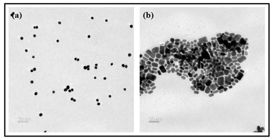 Gold nanoparticle analysis by TEM images ((a) sphere-shaped, (b) rod-shaped).