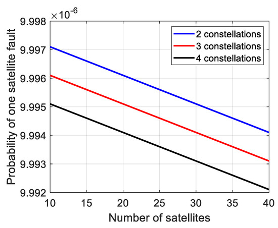 One satellite fault is the basic fault mode in ARAIM. As shown in Figure 1, the probability of one satellite fault decreases with the increase in visible satellites. What is worse, more constellations result in smaller probability. Similar probability loss can be derived in the other fault modes, like two satellites fault and one satellite and one constellation fault. On the other hand, as shown in Figure 2, with the increase in visible satellites, the total required probability for monitor increases linearly. More constellations result in higher required probability. As one falls, another rises. The result is that more fault modes are needed to be monitored and more subsets are needed to be calculated to meet the inequality (3).