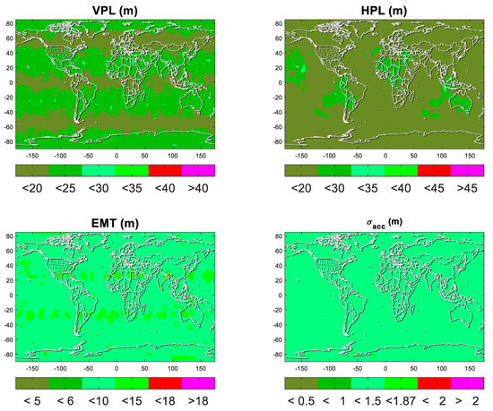Figure 5 shows the four indicators for LPV-200. The ARAIM is not considered available once any of the four indicators are not met the requirements of LPV-200. The figure shows the biggest values of 99.5% time at the test points. The plots are discretized to six color bins. Two colors of red represent values beyond the threshold and the other four colors of green represent values below the threshold. Regarding the VPL, most areas of the world are below 25 m and equatorial and mid-latitude regions are even below 20 m, which is far below the requirement of VAL = 35 m. The same phenomenon can be found in HPL, EMT, and vertical accuracy. The two constellations selected keeps the performance of ARAIM.