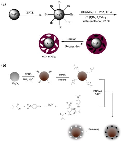 Generally, the inorganic nanoparticles are modified with a silica layer to provide facile and robust surface modifications, increase biocompatibility, avoid the leakage of metal ions, and prevent their surface oxidation. This approach has been extensively used for modifying magnetic nanoparticles before their utilization as a core. It should be noted that the additional silica layer leads to a decreased magnetization of Fe3O4, but it is still sufficient for applications []. For example, Liu et al. proposed a novel Fe3O4@SiO2 @NH2 nanoparticle with a pefloxacin mesylate (PEF-M) imprinted shell []. The fabrication of this novel nanoparticle started with TEOS functionalization in the presence of ammonium hydroxide to obtain a silica layer onto the Fe3O4 nanoparticles. Later, the amino groups were introduced onto the Fe3O4@SiO2 by treatment with ammonium hydroxide and APTES. This step was followed by the preparation of imprinted polymer shells by ATRP. Another example was reported by Mehdinia et al. [], where authors utilized the grafting method for the selective recognition of 4-nitrophenol (4-NP). They first modified the magnetic nanoparticles with tetraethyl orthosilicate (TEOS) and 3-methacryloxypropyl trimethoxy silane (MPTS). Then the surface was used for grafting a polymeric layer composed of the functional monomer methacrylic acid (MAA) and cross-linker ethylene glycol dimethacrylate (EGDMA). They investigated the nanoparticles’ adsorption capacity and selectivity performance by comparison with non-imprinted polymers (Figure 5b).