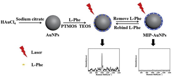 For example, in 2015, Yang et al. designed a MIP-coated Au nanoparticle system that was covered onto an electrode to build an electrochemical sensor []. First, the Au nanoparticles were synthesized by reducing HAuCl4. Then, an ionic liquid (IL) was self-assembled onto the nanoparticle surface to be further used as a monomer to synthesize MIPs in the presence of dimetridazole as the template, EGDMA as the cross-linker, and AIBN as the initiator. The resultant core-shell nanoparticle system was coated onto the carbon and graphene-modified glassy carbon electrode surface to build a sensor. Recently, another example of the MIP-coated Au nanoparticles for the selective recognition and quantification of L-phenylalanine (L-Phe) was demonstrated by Zhou et al. []. MIP@Au nanoparticles were utilized as a surface-enhanced Raman scattering (SERS) interface. After preparing the Au nanoparticles, the authors constructed the imprinted polymer layer onto the nanoparticles by sol-gel and surface imprinting techniques (Figure 7). The polymerization was performed with tetraethyl orthosilicate as the cross-linker and phenyltrimethoxysilane as the functional monomer. When removal of the template molecule from the MIP shell was completed, rebinding was observed according to the obtained SERS signals.