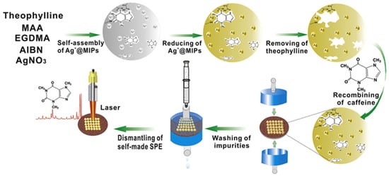 The utilization of Ag nanoparticles plays a vital role in biomedical applications among metallic nanoparticles. Using them as a SERS substrate is widely used and well-established in the literature []. For the fabrication of a MIP-based SERS sensor, Hu et al. developed theophylline-imprinted polymer-loaded Ag nanoparticles []. They used precipitation polymerization to form the Ag@MIP system to be further used as a solid phase extraction (SPE) agent and SERS substrate for the single-step extraction and the quantification of caffeine. Theophylline was chosen as the dummy template. The polymeric layer was formed in excess acetonitrile with MAA as the functional monomer and EGDMA as the cross-linker (Figure 9). The overall time for the detection and separation of caffeine was determined as 23 min with a detection limit of 100 ng/L.