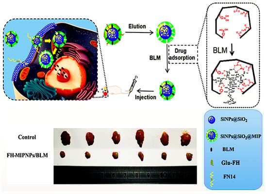 Jia et al. [] presented a MIP@nanoparticle design for the dual templates; bleomycin (BLM) and 71–80 peptide of human fibroblast growth-factor-inducible 14 modified with glucose (Glu-FH). They first synthesized the SiO2 nanoparticles and modified them by silanization. Dual templates-imprinted polymers covered the surface of nanoparticles to be used for both targeting and the drug delivery for pancreatic cancer BxPC-3 cells. Targeting and the drug release performances of the design were first confirmed by in vitro experiments, followed by the in vivo tumor treatment. The results proved these MIP-coated nanoparticles’ low toxicity and tumor growth inhibition capacity (Figure 11).