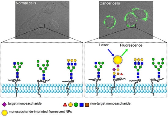 - Wang, S.; Yin, D.; Wang, W.; Shen, X.; Zhu, J.-J.; Chen, H.-Y.; Liu, Z. Targeting and Imaging of Cancer Cells via Monosaccharide-Imprinted Fluorescent Nanoparticles. Sci. Rep. 2016, 6, 22757. [Google Scholar] [CrossRef] [PubMed]