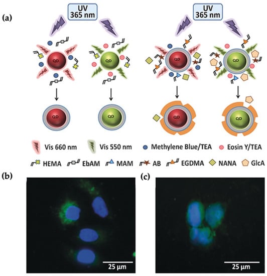 (a) Demonstration of red and green light emitting QDs excited by UV and MIP shell around the particles. (b,c) Staining of keratinocytes, (b) KU812 cells, (c) with MIP@QDs Reproduce with permission from [].
