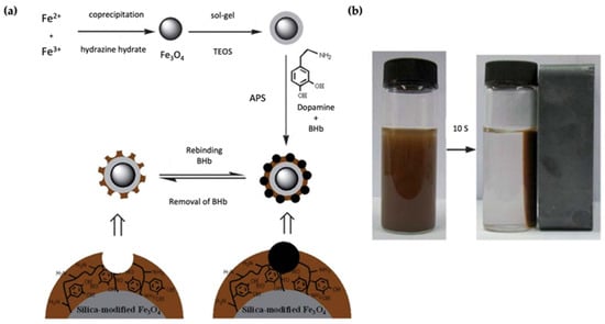 (a) General preparation of BHb imprinted SiO2@Fe3O4 nanoparticles, (b) magnetic response of the nanoparticles in the presence of an external magnetic field. Reproduce with permission from [].