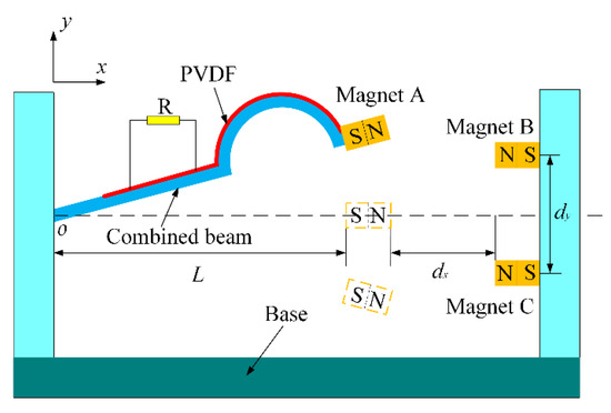 Figure 1 shows the schematic diagram of the structure of CTPEH, which mainly consists of a base, a combined beam, piezoelectric material, and magnets. The combined beam is composed of a linear straight beam and an arched curved beam, one end of which is fixed on the inner wall on the left side of the base, whilst the other end is free. The piezoelectric material is a polyvinylidene fluoride (PVDF) piezoelectric film, which is attached to the upper surface of the combined beam. Its positive and negative electrodes are connected to both ends of the load resistor R. Magnet A is fixedly connected to the free end of the combined beam, whilst the magnets B and C are symmetrically fixed to the inner wall of the right side of the base about the x axis, and the magnetic forces between magnet A and magnets B and C repel each other. As shown in the figure, the transverse length of the combined beam is , the surface distance between magnet A and magnets B and C along the x axis is , and the center distance between magnet B and magnet C along the y axis is . When the base is excited along the y axis direction, the combined beam will bend, and the piezoelectric film on the surface will also deform to generate electricity.