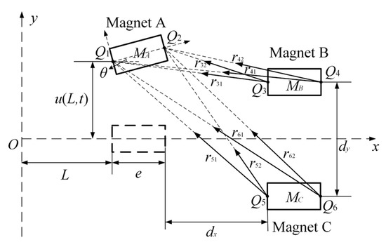 where , , . is the vacuum magnetic permeability; is the vibration displacement of magnet A along the y axis direction; and is the deflection angle of magnet A relative to the x axis.