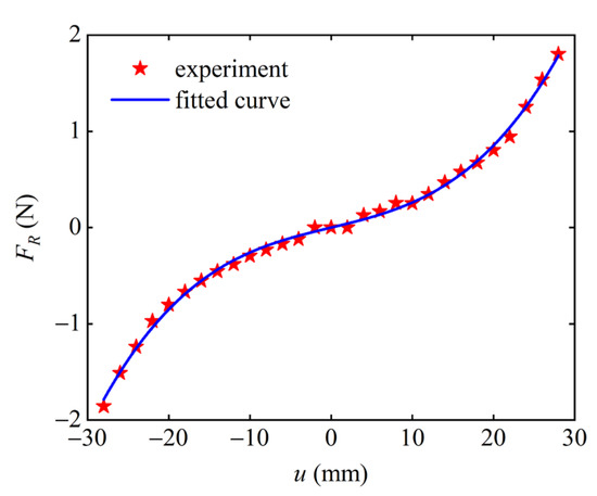The restoring force of the combined beam in this paper is relatively complicated due to the existence of curved beam parts. The traditional straight beam is generally considered a linear restoring force, while the restoring force of the combined beam is nonlinear. This paper used a dynamometer (YLK-10, ELECALL, Yueqing, China) to survey the restoring force of the combined beam several times, and then took the mean value of the measured data, and finally used MATLAB (version 9.1, accessed on 15 June 2022) to perform a nonlinear curve fitting. The polynomial expression of the restoring force–displacement is obtained as follows: