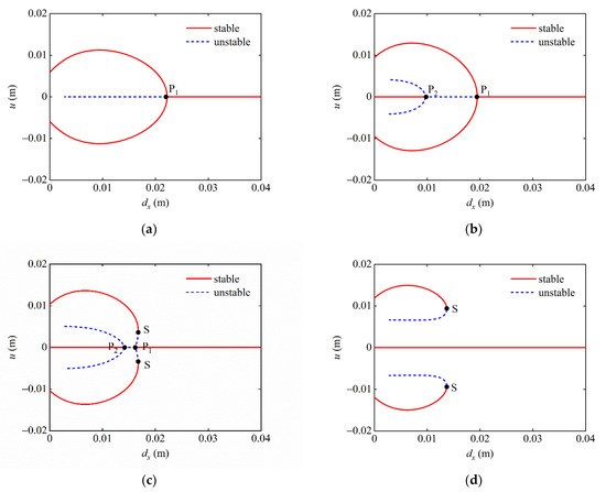 Then, the effect of on the static bifurcation characteristics of the system is analyzed in the (, ) plane. When , the bifurcation point P1 and the saddle point S are divided into three segments, as shown in Figure 7a. When is taken to the right of the saddle point S, the system has only one stable equilibrium point and is in a mono-stable state. When the value of is on the left side of the bifurcation point P1, the system has two stable points and one unstable equilibrium point, presenting a bi-stable state. When is between the points P1 and S, the system has three stable and two unstable equilibrium points, at which time the system exhibits tri-stable characteristics. Figure 7b,c show the static bifurcation for and . As can be seen from the figure, with the gradual increase in , the position of bifurcation point P1 is basically unchanged, while the two saddle points S gradually move to the left, resulting in a larger range of being in a mono-stable state and a smaller range of being in a tri-stable state of the system. When , it can be seen from Figure 7d that the two saddle points S of the system disappear, and the bifurcation point P1 gradually moves to the left. When is taken on the right side of P1, the system is a mono-stable system, and when is taken on the left side of P1, the system presents bi-stable characteristics.