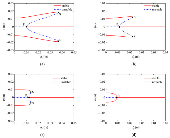 Static bifurcation diagram of the system under different magnet distances : (a); (b) ; (c); and (d) .