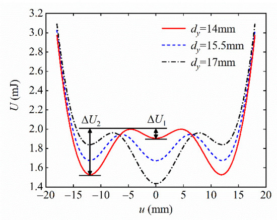 - When the system exhibits a tri-stable state, the system has three potential energy wells. In the range of tri-stable, when the magnet distance is certain, adjusting the magnet distance can alter the depth of three potential wells of the system, thereby changing the shape of the potential energy curve of the system.