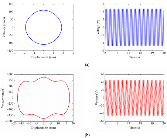 Experimental phase portrait and time–voltage diagram at different excitation frequencies: (a); and (b).