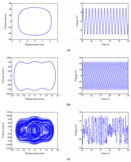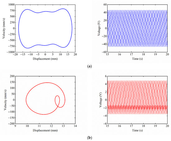 When , , and Figure 9 shows the phase portrait and time–voltage diagram of the system at different starting positions. When starting from the central equilibrium position, as shown in Figure 9a, the system cannot overcome the hindrance of the central potential barrier due to the large depth of the central potential well. Therefore, the system can only make small-amplitude movements within the central potential well, which results in a small response displacement and voltage. When starting from the right-side equilibrium position, as shown in Figure 9b, due to the small depth of the side potential well, the system can overcome the hindrance of the side potential barrier and enter the central potential well. Since the system has obtained greater kinetic energy at this time, the system can also overcome the large central potential barrier to achieve a large-amplitude movement between the wells, and the response displacement and voltage of the system are greatly improved.