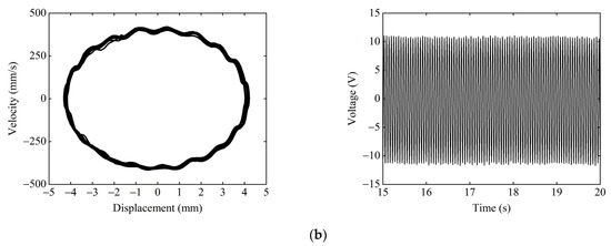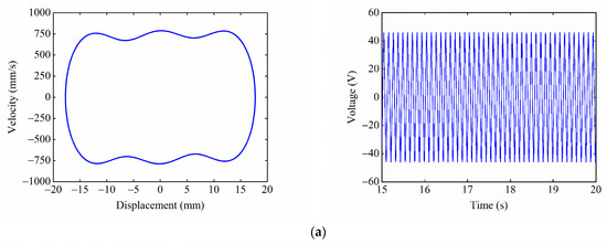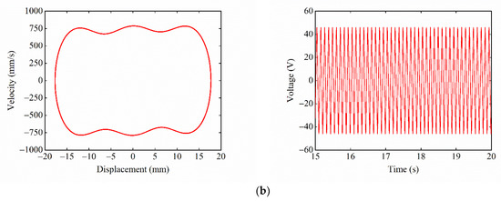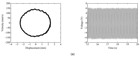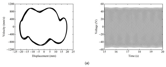Given the excitation acceleration , magnet distance , and , the starting position is the central equilibrium position. Figure 17 shows the experimental phase portrait and the time–voltage diagram at different excitation frequencies. Figure 17a shows the system performing the tri-stable large-amplitude periodic motion at , as the excitation frequency at this point matches the large-amplitude response frequency of the system. The response displacement of the system is , and the output voltage is . Figure 17b shows that, at , the system can only make the small-amplitude periodic motion in the well because the excitation frequency deviates from the large-amplitude response frequency of the system. The response displacement of the system is reduced to , and the output voltage is lowered to .