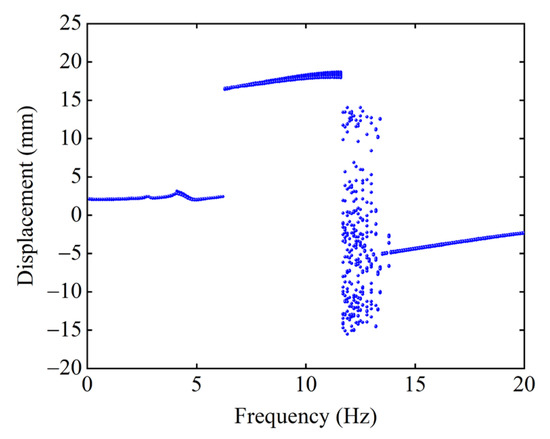 Given that the starting position is the central stable equilibrium position, the magnet distance , , and the excitation acceleration , Figure 12 shows the excitation frequency–displacement bifurcation diagram of the system. According to the transition of the motion state of the system, the excitation frequency can be divided into four intervals, which are , , , and . When is below , the system is constrained to make a small-amplitude motion in the well, resulting in a small response displacement. When is in the range of , the system achieves inter-well motion and is continuously in a large-amplitude response state, and the large-amplitude response bandwidth of the system is . When is between , the system exhibits a state of chaotic motion, and the response displacement of the system is very unstable. When is above , the system can only move in the well and is in a state of small-amplitude response. In addition, it can be found that the effective energy harvesting bandwidth of the system is significantly improved by introducing a nonlinear magnetic force.