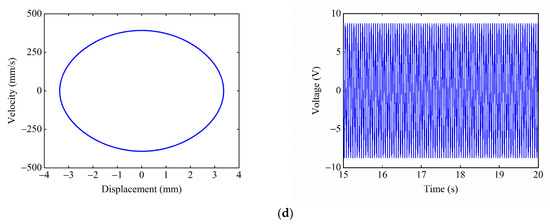 Phase portrait and time–voltage diagram of the system under different excitation frequencies: (a); (b); (c); and (d).