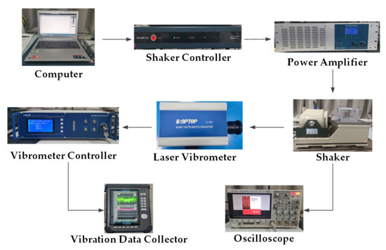 During the experiment, the experimental prototype is installed on the shaker, and the shaker controller generates a vibration signal through the control software on the computer. The power amplifier amplifies the signal and inputs it into the shaker, and the experimental prototype vibrates under the action of the shaker. The laser vibrometer and the vibration data collector are used to measure and collect the response velocity and displacement of the combined beam, respectively. The oscilloscope is used to collect the output voltage of the prototype.