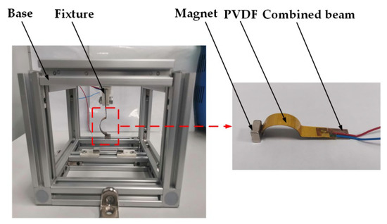 To validate the correctness of the simulation results, a test platform of the CTPEH system was built, and an experimental prototype was made in this paper. Figure 14 shows the experimental test platform. It is mainly composed of a computer, shaker (LT-50ST, ECON, Hangzhou, China), shaker controller (VT-9008, ECON, Hangzhou, China), power amplifier (VSA-L1000A, ECON, Hangzhou, China), laser vibrometer (LV-S01, SDPTOP, Shanghai, China), vibrometer controller (LV-S01, SDPTOP, Shanghai, China), vibration data collector (CoCo-80X, CRYSTAL, Silicon Valley, CA, USA), and oscilloscope (DSOX3024T, KEYSIGHT, Santa Rosa, CA, USA). Figure 15 shows the experimental prototype of CTPEH, which mainly consists of a base, fixture, PVDF piezoelectric film, combined beam, and magnet. One end of the combined beam is clamped and fixed to the base, while a magnet is attached to the other end. Two magnets are symmetrically fixed to the base, and the PVDF piezoelectric film is uniformly glued to the surface of the combined beam.