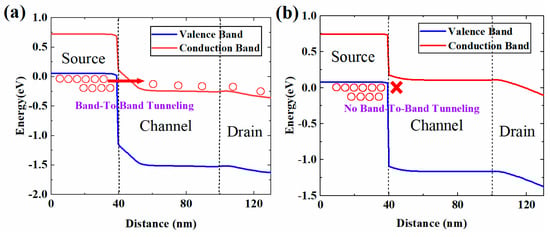 Figure 2 shows the ON-state and OFF-state energy band diagram of HJ-LTFET. The cutline positions are shown by the red dotted lines. In the ON-state, as shown in Figure 2a, electrons are tunneling from p+ GaAsSb source to n+ InGaAs channel. with the gate voltage increasing, the energy bands near the heterojunction will bend downward to meet the BTBT condition. After tunneling, the electrons will transfer from channel to drain and finally be collected by the drain electrode. In the OFF-state, as shown in Figure 2b, there no BTBT occurs, and no tunneling current is observed in HJ-LTFET.