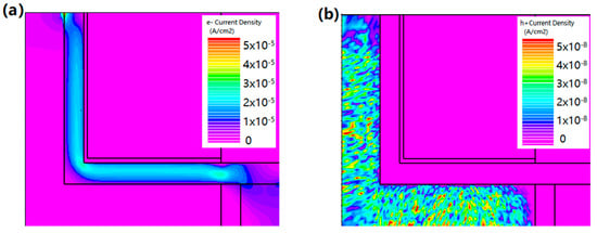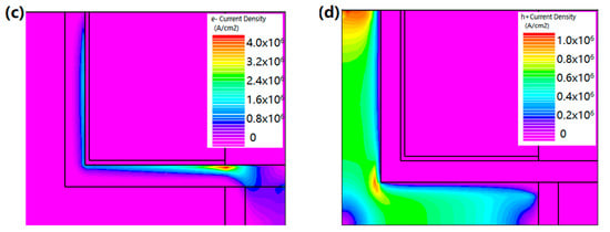 Simulated diagrams of (a) OFF-state electron current density, (b) OFF-state hole current density, (c) ON-state electron current density, and (d) ON-state hole current density at VDS = 0.5 V.