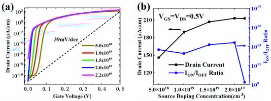 3.1. Effect of Doping Concentration in Source, Channel, and Drain on Device Performance