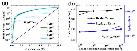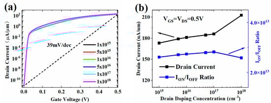 The HJ-LTFET is robust to variations in channel doping concentration (NC) and drain doping concentration (ND). Changes in NC and ND have little effect on the transfer characteristic, ION, and ION/IOFF, as shown in Figure 5 and Figure 6. The increase of NC and ND will reduce the channel resistance, resulting in a slight increase in the ION, as shown in Figure 5b and Figure 6b. However, when the drain doping increases to 1 × 1018 cm−3, Figure 6b shows that the IOFF will increase sharply, resulting in a decrease in the ION/IOFF. This is because the tunneling barrier between source and drain region will decrease with the increase of ND. When the barrier is lower than a certain value, SDT leakage current will be generated.