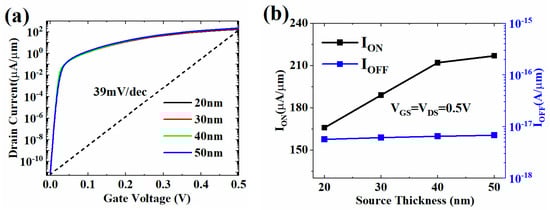 Figure 7 shows the change of the transfer characteristic, ON-state current, and OFF-state current of HJ-LTFET with different source thickness (TS). It is not difficult to find that, with the increasing TS, the ION increases continuously, and the variation of IOFF can be ignored, which is maintained at around 6 × 10−12 μA/μm. This is because the increase of TS promotes the generation of free electrons in the source region, thereby increasing the number of tunneling electrons from source to channel and ultimately increasing the current density in the ON-state.