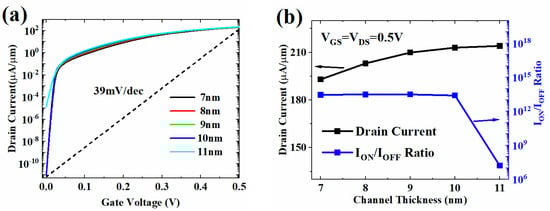 Figure 8 shows the change of the transfer characteristic, ON-state current, and switching current ratio of HJ-LTFET with different channel thickness (TC). Since the increase of TC increases the area of diagonal tunneling between source and drain, the ION increases with the increase of TC, as shown in Figure 8b. However, when the TC is greater than 10 nm, it will also form an extremely serious tunneling current in the OFF-state, resulting in a decline in device switching performance. In general, it is necessary to compromise between high ION and low IOFF.