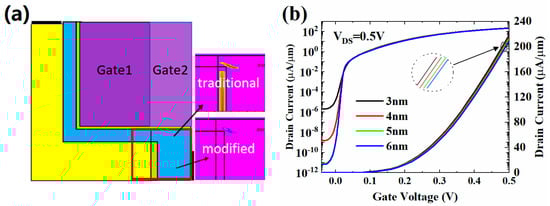 Figure 9 compares the effect of traditional low-doped spacer layer and modified HFO2 barrier layer with varying thickness between the source and drain on suppressing SDT leakage in OFF-state. It is not hard to find, in Figure 9a, that the SDT phenomenon (consisting of source-to-drain horizontal tunneling and source-to-drain diagonal tunneling) of the traditional structure in OFF-state is particularly serious. After the HfO2 barrier layer is used, the OFF-state electron tunneling on the horizontal direction of source and drain is completely suppressed, which shows that the performance of the modified structure has been greatly improved. For the diagonal tunneling between source and drain, the OFF-state leakage can be further reduced by increasing the thickness of the barrier layer, as shown in Figure 9b. This is because the increased barrier thickness weakens the drain voltage and increases the barrier height of SDT. At the same time, the ION marginally declines as the barrier layer’s thickness increases.