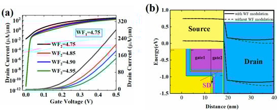 In order to analyze the reasons for the above results, the distribution of energy band with or without work function modulation in OFF-state is shown in Figure 10b. The source-to-drain diagonal tunneling is the main cause of OFF-state leakage, and increasing WF2 appropriately can reduce the probability of such tunneling. This is because the energy band close to the drain is raised with the increase of WF2, and the elevation of the conduction band in the drain region increases the barrier of SDT. Therefore, by the application of multi-metal work function, the OFF-state tunneling phenomenon can be suppressed greatly.