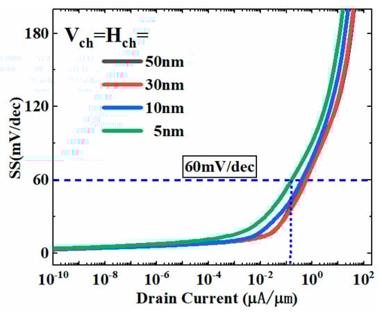 Figure 11 shows the curve of subthreshold swing (SS) varying with channel length. It is clear to find that the SS changes weakly as the channel length decreases in the vertical and horizontal directions (Vch and Hch). The SS is still lower than 60 mv/dec at Id = 0.1 μA, even if the channel length is reduced to 5 nm in both vertical and horizontal directions. This is because the L-shaped channel expands the length to a certain extent by making full use of the vertical space. Compared with conventional planar TFET, the short-channel effects is not prominent with the scaling of the device. Therefore, this structure has excellent scaling capability and device reliability.