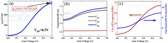 It is generally believed that the parasitic capacitance of devices is crucial to the frequency characteristics of integrated circuits, especially the gate capacitance (Cgg). For proposed device structure, Cgg generally consists of gate-to-source capacitance (Cgs) and gate-to-drain capacitance (Cgd). Therefore, the characteristics of Cgg, Cgs, and Cgd are of great significance for evaluating the frequency characteristics and analog application ability of devices. As shown in Figure 12b, the Cgd of the HJTFET under 0.5 V gate voltage is 0.15 fF/μm at Vd = 0.5 V, which is much smaller than that of the Cgs (2.0 fF/μm at Vd = 0.5 V). Thus, the Cgg of the HJTFET is mainly determined by Cgs, unlike the general heterojunction devices. This is closely related to the bias voltage applied on the gate and drain.