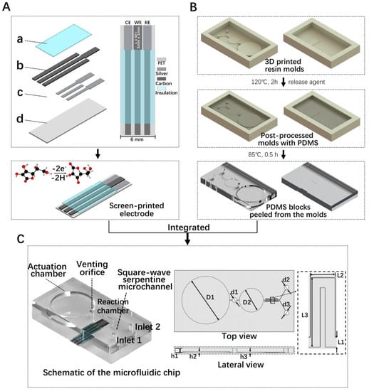 (A) Scheme of silver/carbon screen-printed electrode (SPE). (a) Insulating layer, (b) carbon track/electrode, (c) silver track/electrode and (d) polyethylene terephthalate (PET) substrate. (B) Scheme of 3D-printed molds and PDMS blocks. (C) Schematic of the integrated microfluidic chip and additional details (reference values: d1 = d2 = d3 = 1–1.5 mm, D1 = 20 mm, D2 = 10 mm, L1 = 0.2 mm, L2 = 0.3 mm, L3 = 1.2 mm, h1 = 1.5–3 mm, h2 = 0.5 mm, h3 = 0.2 mm).