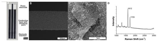 Figure 2A is the overall structure morphology of the fabricated SPE. The microstructure and morphology of the SPEC were characterized by scanning electron microscopy (SEM). Figure 2B shows that the surface morphology of the SPEC was relatively uniform and compact. Moreover, Figure 2C shows that a large number of carbon black nanoparticles were distributed on the surface of the graphite. From the Raman spectrum at an excitation wavelength of 532 nm in Figure 2D, the positions of the observed bands at 1612 cm−1 and 1725 cm−1 are in agreement with the Raman bands reported previously for carbon black [46]. Such carbon black particles increased the surface roughness of the electrodes and therefore increased the specific surface area, which is beneficial for constructing a highly dispersed conductive network and enhancing the electrochemical signal [47,48].