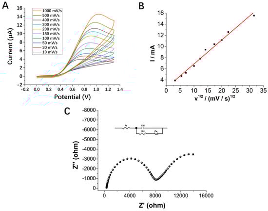 (A) CV responses of SPE at different scan rates (10–1000 mV/s) in 2500 µM of AA solution. (B) The plot of the anodic current versus the square root of increasing scan rates (10–1000 mV/s), R2 = 0.98597. The experiments were carried out at a volume of 40 μL sample on the electrode surface. (C) Nyquist plots in the frequency range from 0.01 Hz to 100 kHz. Inset is Randles equivalent circuit.