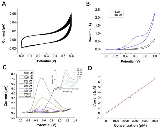 The CV study was carried out to preliminarily explore the oxidation behavior of the electrode when AA was added. Figure 4A shows the 50 sweep segments CV curve in PBS, which proves the robustness of the electrode [51]. Figure 4B is a comparison of the CV curves obtained at a scan rate of 50 mV s−1. Compared with the electrolyte without the addition of AA, the current increases in the presence of 250 µM AA, which indicates that AA was oxidized during the reaction. The DPV was used to analyze different concentrations of AA, as seen in Figure 4C. Compared with CV, the DPV method can provide a single-run voltammetric detection with better sensitivity and efficiency [52]. Figure 4D shows the DPV response fitting curve of the electrode in different concentrations of AA solution. The results showed that as the concentration of AA increases, the peak oxidation current increases linearly. It indicates that the concentration of the analyte is proportional to the peak oxidation current. AA is a substance with a lactone ring, which undergoes two-electron oxidation to generate dehydroascorbic acid. This linear relationship confirms that the analyte releases 2e− and 2H+ during the oxidation process, which in turn increases the oxidation peak current [50]. In the CV pre-test shown in Figure 4B, the scan rate is set to 0.05 V/s. According to Figure 3A, the higher scan rate leads to stronger polarization and larger oxidation peak potential. After optimization, the DVP detection parameters are finally determined as follows: initial E = 0 V, final E = 1.3 V, step E = 0.03 V, amplitude = 0.04 V. As shown in Figure 4D, when n = 3 (three different electrodes of the same batch), there was an obvious linear relationship between the peak current and the concentration of AA. It has a calculated detection limit value of 1.038 µM and a linear range of 10 µM–5000 µM. Separately, twenty SPEs in the same batch were used to detect the same concentration of AA, and the relative standard deviation (RSD) was 8.95%, indicating the good reproducibility of the SPEs. Variation caused by different production batches can be resolved by normalization.