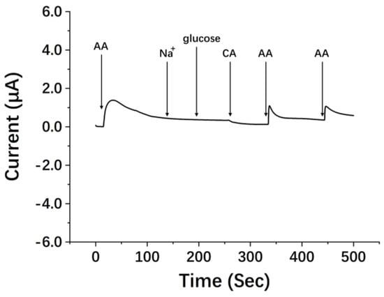 In addition, selectivity is a very challenging issue for non-enzymatic detection methods. Therefore, when the oxidation potential was +0.4 V, the influence of interfering substances such as, Na+ ions, glucose and citric acid (CA) on the SPEs’ detection of AA was tested by the amperometric method. As shown in Figure 5, 250 μM UA, 250 μM Na+ ions, 1 mM glucose and 250 μM CA had little interference with the detection of 250 μM AA, which indicated the selectivity and reliability of the sensor. We also supplemented the results of voltammetry under the same conditions. The raw data of DPV detection in the presence of interfering substances are shown in Supplementary Material Figure S9 (without noise reduction). It can be seen from the figure that the interfering substances have little effect on AA detection, and there is only a slight fluctuation at 0.9 V.