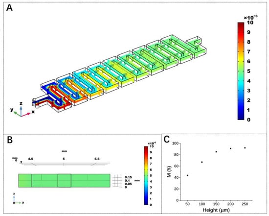 The mixing efficiencies of straight channels and serpentine channels with heights of 50 µm, 100 µm, 150 µm, 200 µm and 250 µm were evaluated, respectively. The results show that when the inlet sample concentration is 100 µM, the samples can hardly mix in the straight channel, and the calculated mixing efficiencies at the outlets of the serpentine channels were 43.7%, 67.0%, 85.1%, 90.9% and 92.0% when the heights of the channels ranged from 50 µm to 250 µm (raw data shown in Supplementary Figures S2–S8, n = 10). Figure 6A,B show that the samples at the end of the serpentine channel have been well mixed. Figure 6C shows that when the channel height is below 200 µm, the mixing efficiency increases significantly with the increase in the height; when the channel height exceeds 200 µm, the improvement is not obvious. Considering the processing accuracy, the actual channel height was set to 200 µm.