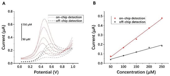 It is obvious from Figure 7A and Supplementary Table S1 that the signal intensity of on-chip detection was higher than that of off-chip detection. The calculated sensitivity of the former was 2.48 times that of the latter. The oxidation potential of on-chip detection was lower and the offset was smaller.