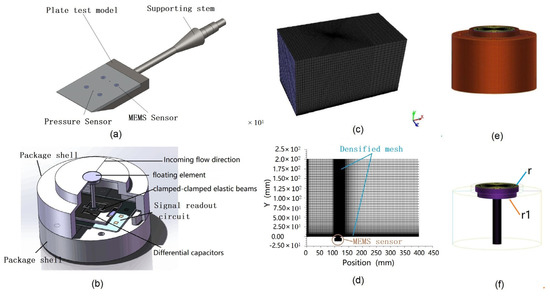 (a) Schematic of a flat plate model embedded with MEMS sensors: (b) schematic of the MEMS skin friction sensor; (c) the 3D mesh model of the flat plate model; (d) the lateral section of the 3D model as 2D plate model of the flat plate; (e) the 3D mesh model of the sensor; (f) the 3D mesh model of the floating element.