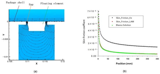 The 3D calculation method is verified by using the Blasius solution of two-dimensional plate laminar flow under the condition of total incoming flow pressure of 1.5 MPa. In this work, the 2D plate model is the lateral section of the 3D model, which is mainly used to compare with the Blasius solution using the laminar flow model and turbulent model (k-e model). The 2D streamline diagram in the friction sensor is shown in Figure 2a, the X direction is the incoming flow direction, and the surface streamline shows that there is suction in the moving gap. It also can be seen that the airflow enters the cavity of the friction sensor along the wall from the gap inlet causing pressure resistance to the leading edge of the floating element head and affecting the friction coefficient. Meanwhile, the numerical simulation value of the friction coefficient at the installation position of the friction sensor (x = 112.6 mm) is 5.09 × 10−4 (directly read out in the model). Compared with Blasius solution 5.11 × 10−4 (), the difference is about 0.39%. Hence, the calculated results of plate surface friction coefficient are in good agreement with the Blasius solution using the laminar flow model as shown in Figure 2b, which also shows that the numerical simulation method and calculation model constructed in this paper is effective.