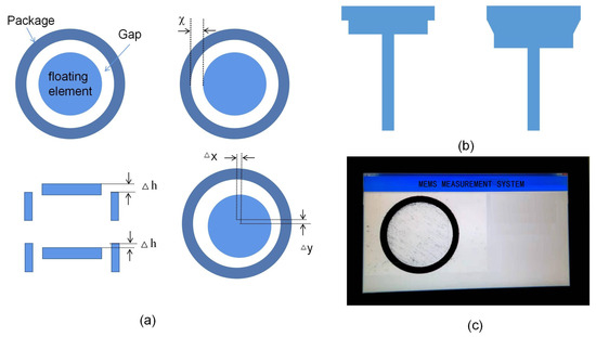 (a) The structural error of the prepared sensor; (b) the floating element with two-layer structure and three-layer structure; (c) the coaxiality measurement of the MEMS sensor.