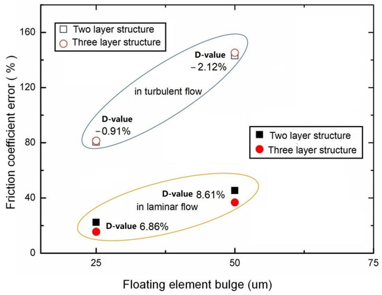 Although the moving g has little effect on the error of the total friction coefficient under the condition of complete alignment, it is difficult for the prepared sensor to be completely flush because the machined parts of the sensor always have errors of tens of microns. Combined with the actual assembly error of the MEMS sensor, it is assumed that the protrusion of the floating element is 50 μm. When the floating element is higher than the measuring wall, the effect of the incoming pressure on the floating element becomes obvious, which makes the pressure friction coefficient increase rapidly. At this time, the influence of the gap on the total friction coefficient error increases significantly. The effect of different gaps on the total friction coefficient in laminar flow is shown in Table 3. It can be seen that the direct friction coefficient error changes little with the increase of the moving gap and remains at about 11%. At the same time, the pressure resistance of the incoming flow has an obvious effect on the whole floating element, and the moving gap has a very significant effect on the error of the friction coefficient of the pressure resistance. The pressure friction coefficient error largely determines the total friction coefficient error (the error accounts for 88% of the total error value when the moving gap is 25 μm). Therefore, it is important to control the misalignment of the sensor with a small moving gap to reduce the friction coefficient error caused by pressure.