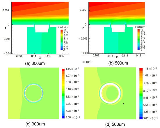Ideally, the floating element is perfectly flush with the measuring wall. The velocity distributions of the friction sensor with a different gap in the Y direction under laminar flow are shown in Figure 6a and Figure 6b respectively. It can be seen that the suction effect of the moving gap is enhanced with the increase of the moving gap size, and the flow field on the measuring wall surface is also changed. The surface friction coefficient program of floating elements with different gaps is shown in Figure 6c and Figure 6d respectively. The results show that the direct friction coefficient at the edge of the floating element in the flow direction also increases with the increase of the moving gap size, and the pressure generated by the air flow entering the friction sensor on the floating element decreases with the increase of the gap size, and the gap size has little effect on the total friction coefficient under the condition of complete flush. The total friction coefficient of the sensors with a different gap is shown in Table 2.