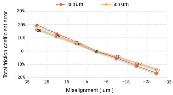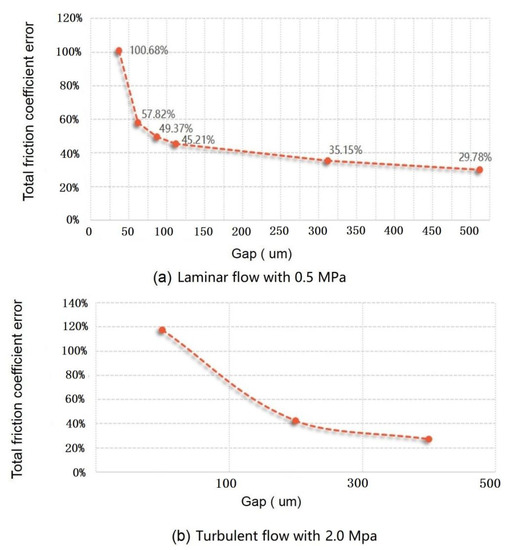 The total friction coefficient error of the sensor with a different gap in laminar flow is shown in Figure 7a. It can be seen that the total friction coefficient error exceeds 100% under laminar flow when the gap of the sensor is less than 25 μm, and the total friction coefficient error quickly decreases to 45% with the gap increasing to 100 μm. As the gap increases from 100 to 500, the error only decreases from 45% to 30%, which also shows that when the gap is greater than 300, the impact of the gap on the error becomes weaker, and the impact of the misalignment on the error will be dominant at this time.