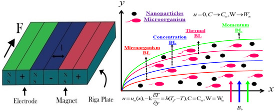 Consider the incompressible and steady flow of second law analysis in Sutterby nanofluid due to the Riga Plate containing gyrotactic microorganisms displayed in Figure 1. Cattaneo–Christov with heat and mass flux has also been pondering the temperature and concentration equation. The x-axis is considered along with the sheet and the y-axis is taken perpendicular to the sheet. Moreover, the sheet of velocity is U w = a x . At the surface of the sheet, the temperature of the surface, the concentration of the surface, and the microorganisms of the surface are symbolized by T w , C w , χ w . The swimming route and velocity of microorganisms do not alter when nanoparticles are present. However, if the volume percentage of nanoparticles exceeds 1%, the motility of microorganisms is impacted. As a result, the base liquid is blended with microorganisms and solid nanoparticles to provide the necessary bioconvection stability. Furthermore, it has been assumed that the fluid contains gyrotactic bacteria. The fluid microorganisms gravitate towards the light. Gyrotactic phenomena, or movement against gravity, are made possible by the “bottom heavy” bulk microorganism, which orients their bodies. The existence of microorganisms is advantageous for the suspension of the nanoparticles. The motion of microorganisms has been taken, irrespective of that of the nanoparticles, to ensure the stability of convection. The flow of a double-diffusive fluid across a stretching sheet containing gyrotactic microorganisms has not yet been investigated, and this study aims to fill that gap with the simplifying of boundary layer approximations of the leading expressions given by [23]: